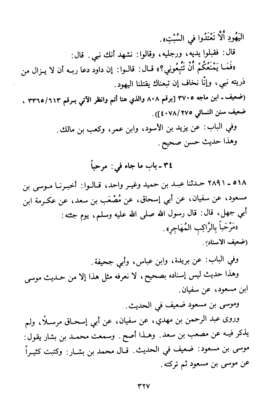 34 - باب ما جاء في: مرحبا 518 - 2891 حدثنا عبد بن حميد وغير واحد، قالوا: أخبرنا موسى بن مسعود، عن سفيان، عن أبي إسحاق، عن مصعب بن سعد، عن عكرمة ابن أبي جهل، قال: قال رسول الله صلى الله عليه وسلم، يوم جئته: " مرحبا بالراكب المهاجر ".
