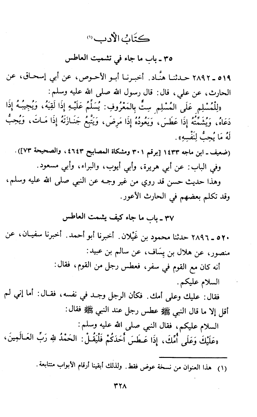 كتاب الادب (1) 35 - باب ما جاء في تشميت العاطس 519 - 2892 حدثنا هناد.