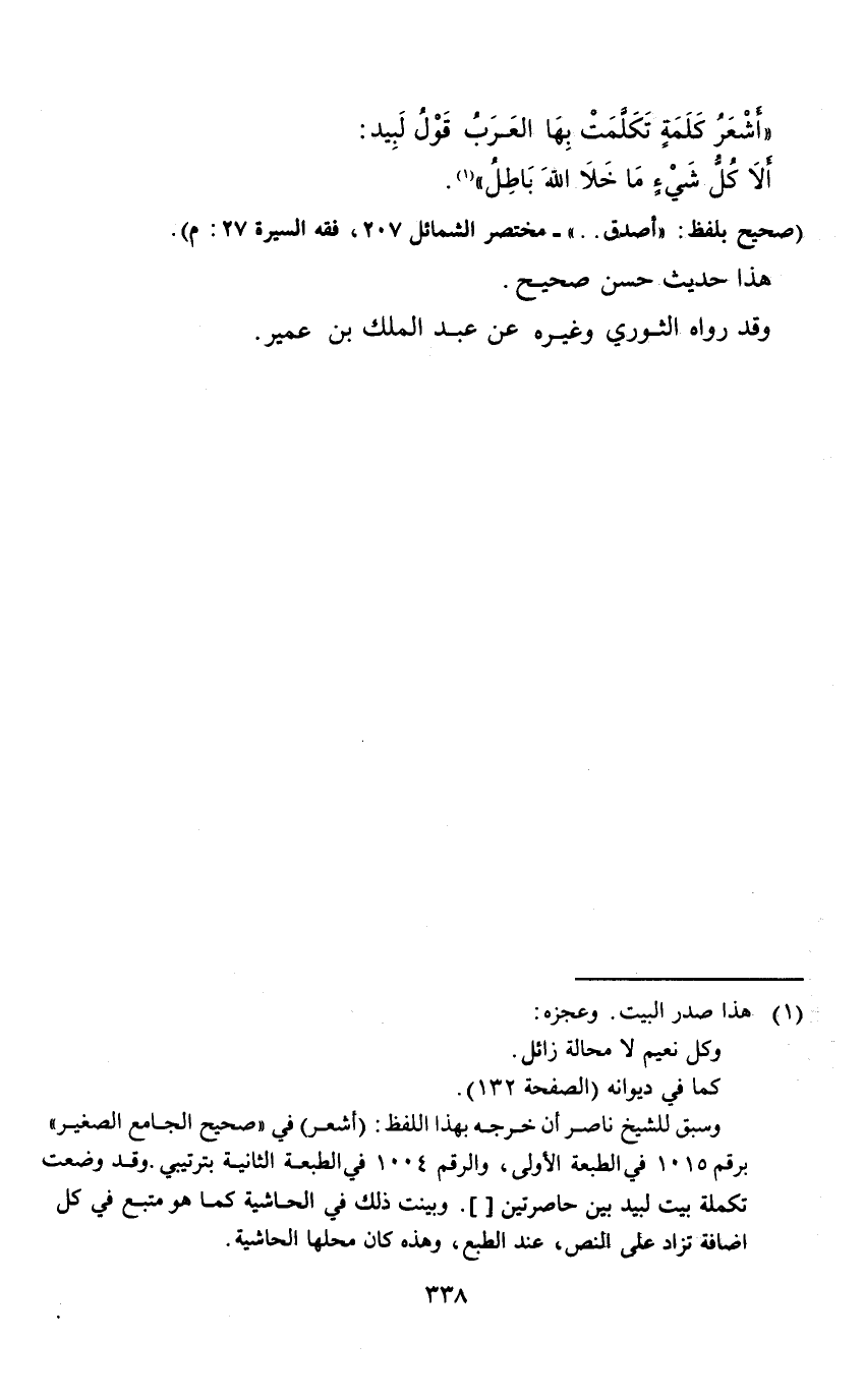 (أشعر كلمة تكلمت بها العرب قول لبيد: ألا كل شئ ما خلا الله باطل " (1) .