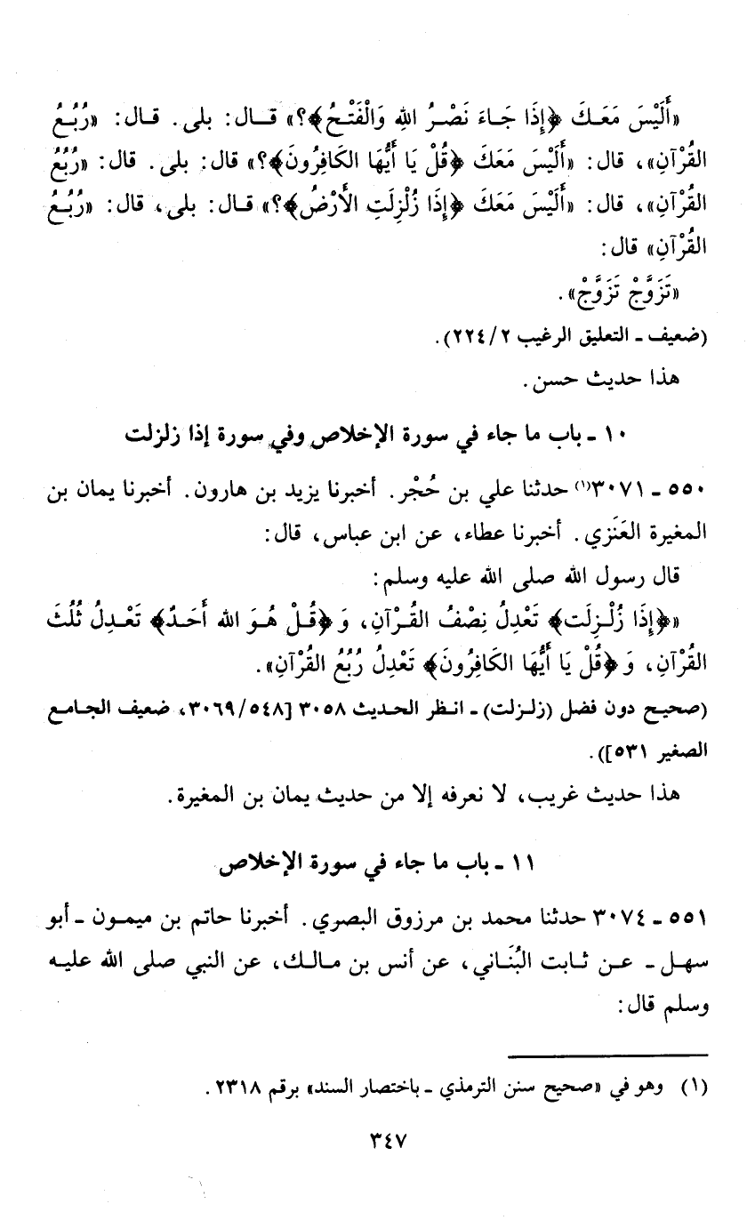 10 - باب ما جاء في سورة الاخلاص وفي سورة إذا زلزلت 550 - 3071 (1) حدثنا علي بن حجر.
