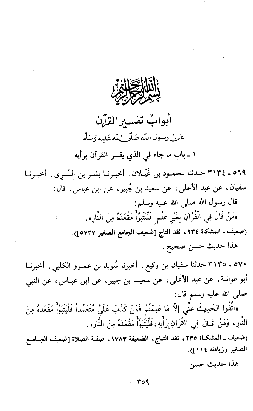 بسم الله الرحمن الرحيم أبواب تفسير القرآن عن رسول الله صلى الله عليه وسلم 1 - باب ما جاء في الذي يفسر القرآن برأيه 569 - 3134 حدثنا محمود بن غيلان.