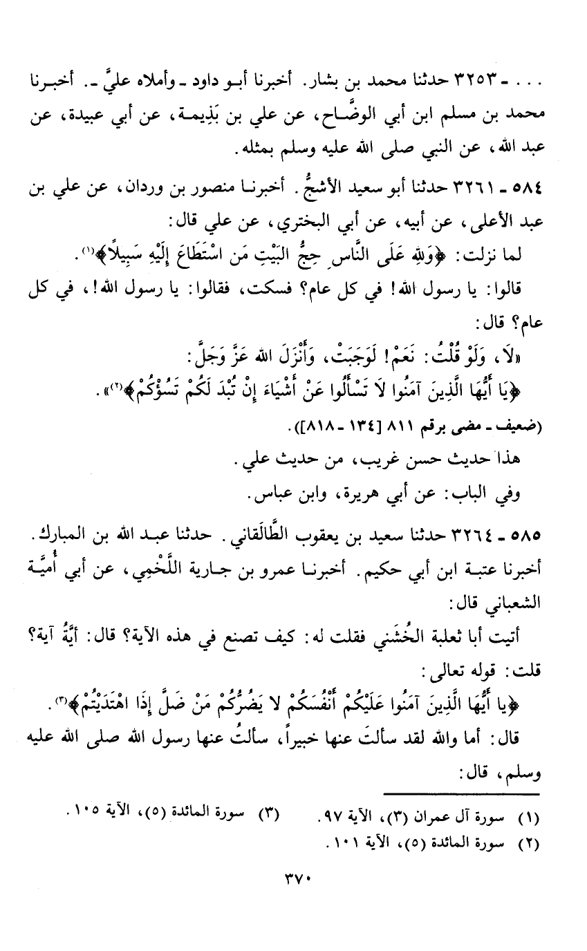 قالوا: يا رسول الله! في كل عام؟ فسكت، فقالوا: يا رسول الله! ، في كل عام؟ قال: " لا، ولو قلت: نعم! لوجبت، وأنزل الله عز وجل: (يا أيها الذين آمنوا لا تسألوا عن أشياء إن تبد لكم تسؤكم) (2) ".