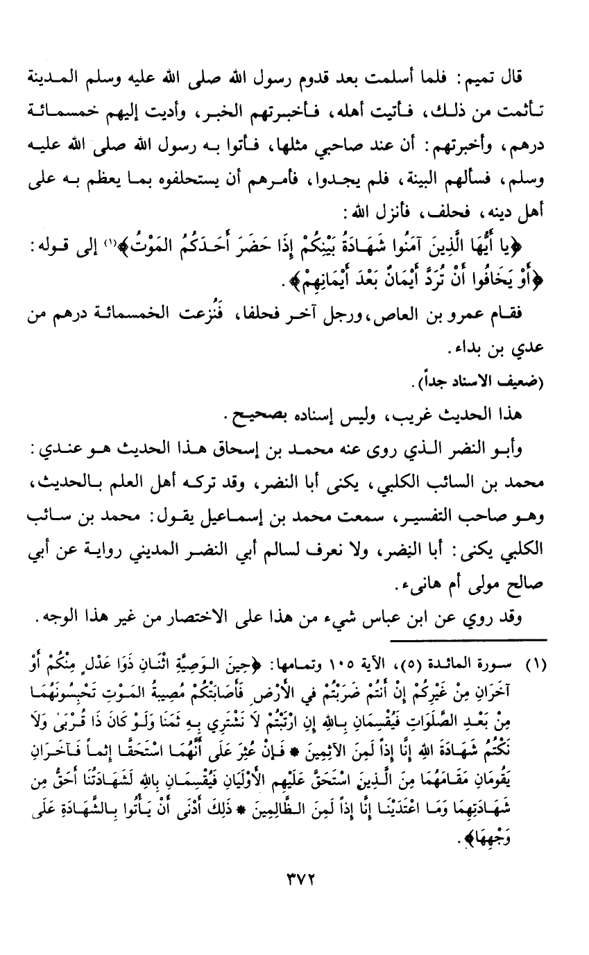 (1) سورة المائدة (5) ، الاية 105 وتمامها: (حين الوصية اثنان ذوا عدل منكم أو آخران من غيركم إن أنتم ضربتم في الارض فأصابتكم مصيبة الموت تحبسونهما من بعد الصلوات فيقسمان بالله إن ارتبتم لا نشتري به ثمنا ولو كان ذا قربى ولا نكتم شهادة الله إنا إذا لمن الاثمين * فإن عثر على أنهما استحقا إثما فآخران يقومان مقامهما من الذين استحق عليهم الاوليان فيقسمان بالله لشهادتنا أحق من شهادتهما وما اعتدينا إنا إذا لمن الظالمين * ذلك أدنى أن يأتوا بالشهادة على وجهها) .