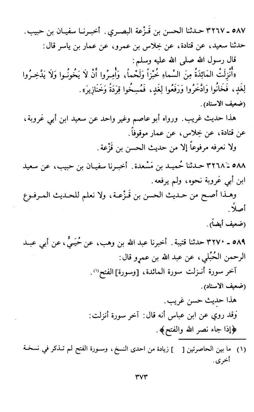 أخبرنا عبد الله بن وهب، عن حيي، عن أبي عبد الرحمن الحبلي، عن عبد الله بن عمرو قال: آخر سورة أنزلت سورة المائدة، (وسورة) الفتح (1) .