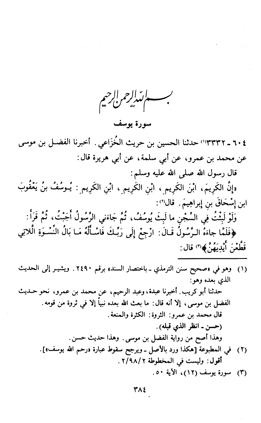 بسم الله الرحمن الرحيم سورة يوسف 604 - 3332 (1) حدثنا الحسين بن حريث الخزاعي.