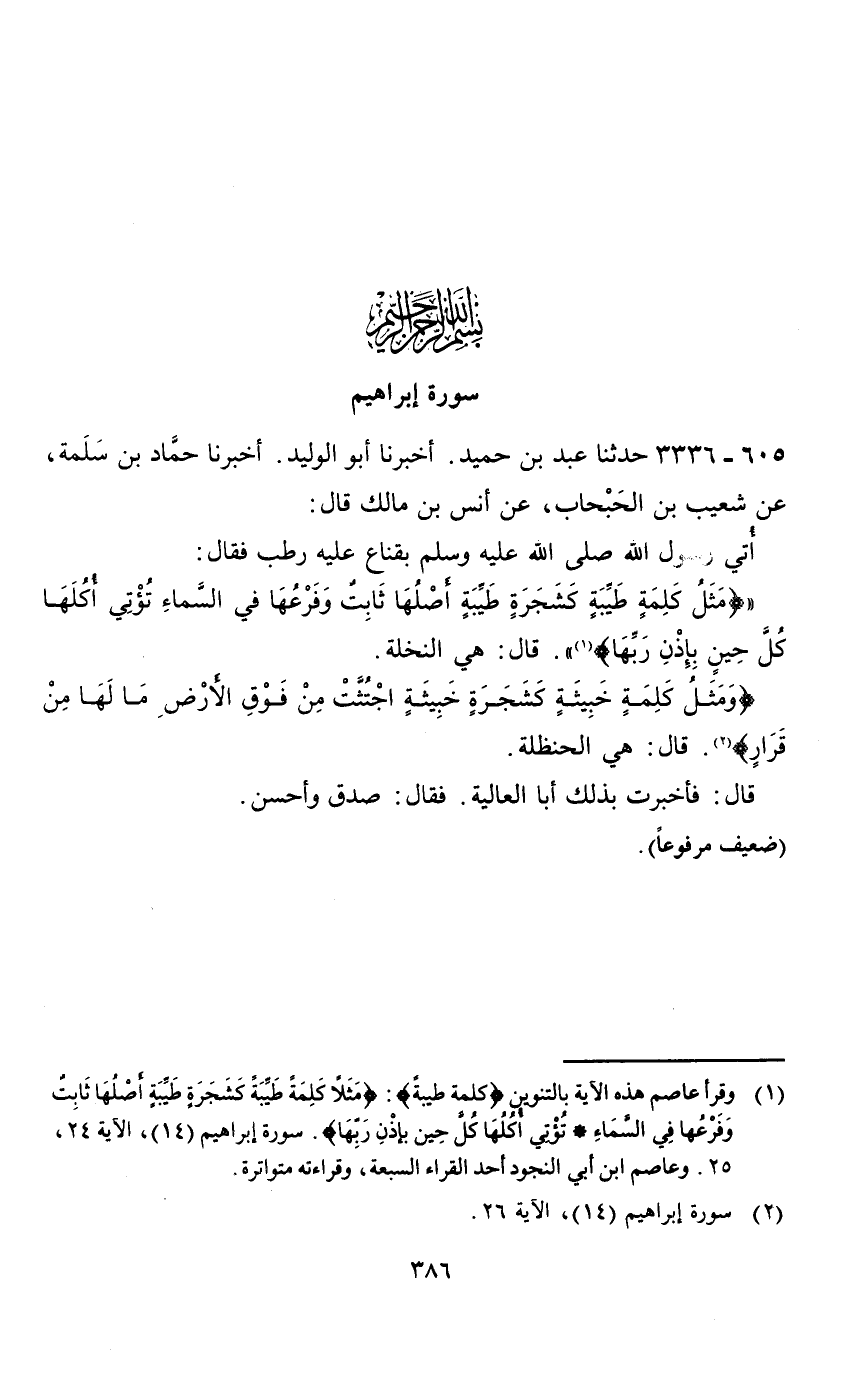 أخبرنا حماد بن سلمة، عن شعيب بن الحبحاب، عن أنس بن مالك قال: أتي رسول الله صلى الله عليه وسلم بقناع عليه رطب فقال: " (مثل كلمة طيبة كشجرة طيبة أصلها ثابت وفرعها في السماء تؤتي أكلها كل حين بإذن ربها) (1) ".
