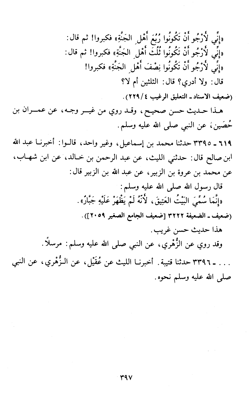 619 - 3395 حدثنا محمد بن إسماعيل، وغير واحد، قالوا: أخبرنا عبد الله ابن صالح قال: حدثني الليث، عن عبد الرحمن بن خالد، عن ابن شهاب، عن محمد بن عروة بن الزبير، عن عبد الله بن الزبير قال: قال رسول الله صلى الله عليه وسلم: " إنما سمي البيت العتيق، لانه لم يظهر عليه جبار ".