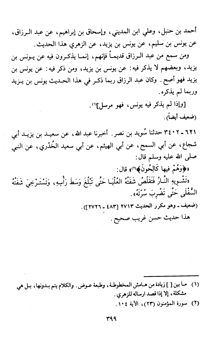 أخبرنا عبد الله، عن سعيد بن يزيد أبي شجاع، عن أبي السمح، عن أبي الهيثم، عن أبي سعيد الخدري، عن النبي صلى الله عليه وسلم قال: " (وهم فيها كالحون) (2) " قال: " تشويه النار فتقلص شفتة العليا حتى تبلغ وسط رأسه، وتسترخي شفته السفلى حتى تضرب سرته ".