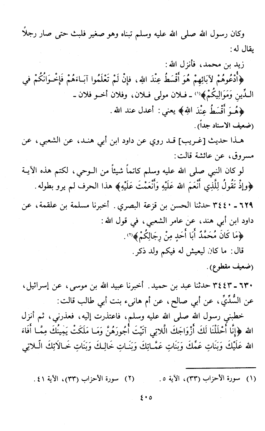 أخبرنا مسلمة بن علقمة، عن داود ابن أبي هند، عن عامر الشعبي، في قول الله: (ما كان محمد أبا أحد من رجالكم) (2) .