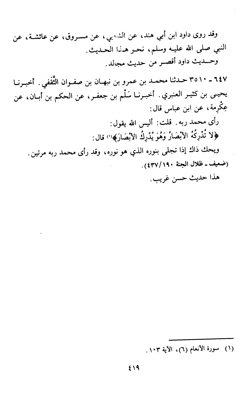 أخبرنا سلم بن جعفر، عن الحكم بن أبان، عن عكرمة، عن ابن عباس قال: رأى محمد ربه.