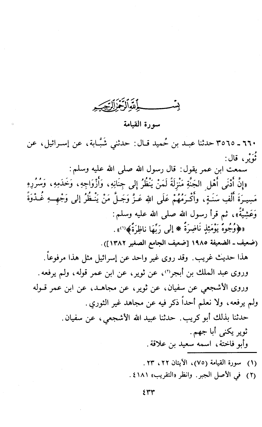 بسم الله الرحمن الرحيم سورة القيامة 660 - 3565 حدثنا عبد بن حميد قال: حدثني شبابة، عن إسرائيل، عن ثوير، قال: سمعت ابن عمر يقول: قال رسول الله صلى الله عليه وسلم: " إن أدنى أهل الجنة منزلة لمن ينظر الله جنانه، وأزواجه، وخدمه، وسرره مسيرة ألف سنة، وأكرمهم على الله عز وجل من ينظر إلى وجهه غدوة وعشية "، ثم قرأ رسول الله صلى الله عليه وسلم: " (وجوه يومئذ ناضرة * إلى ربها ناظرة) (1) ".