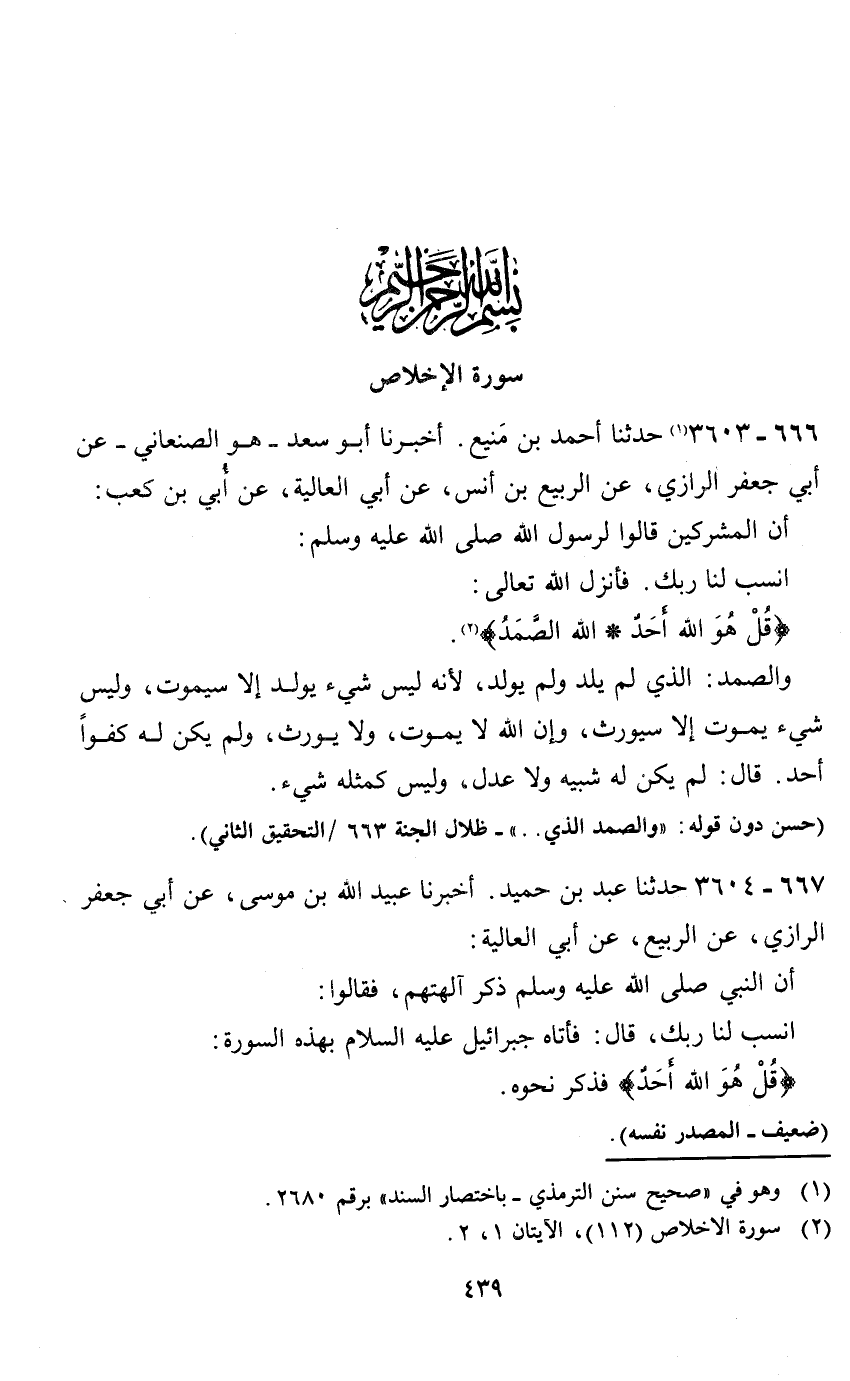 بسم الله الرحمن الرحيم سورة الاخلاص 666 - 3603 (1) حدثنا أحمد بن منيع.