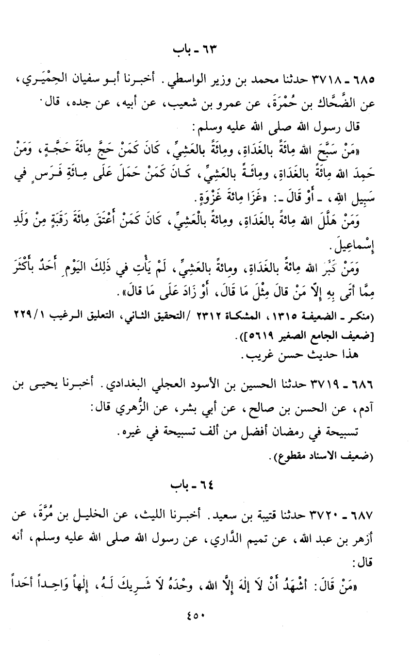 قال رسول الله صلى الله عليه وسلم: " من سبح الله مائة بالغداة، ومائة بالعشي، كان كمن حج مائة حجة، ومن حمد الله مائة بالغداة، ومائة بالعشي، كان كمن حمل على مائة فرس في سبيل الله، - أو قال -: " غزا مائة غزوة.