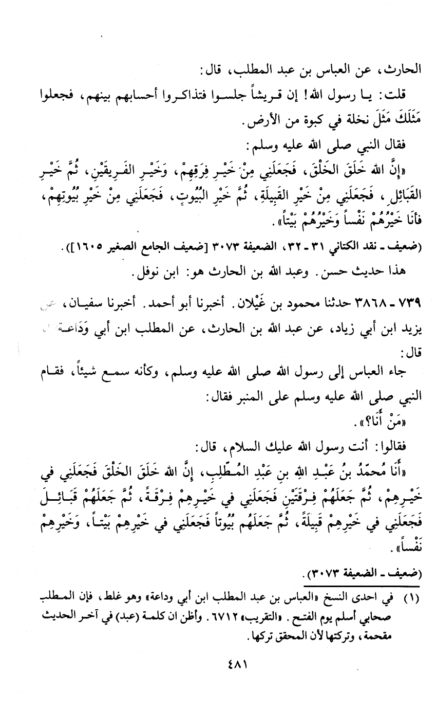 الحارث، عن العباس بن عبد المطلب، قال: قلت: يا رسول الله! إن قريشا جلسوا فتذاكروا أحسابهم بينهم، فجعلوا مثلك مثل نخلة في كبوة من الارض.