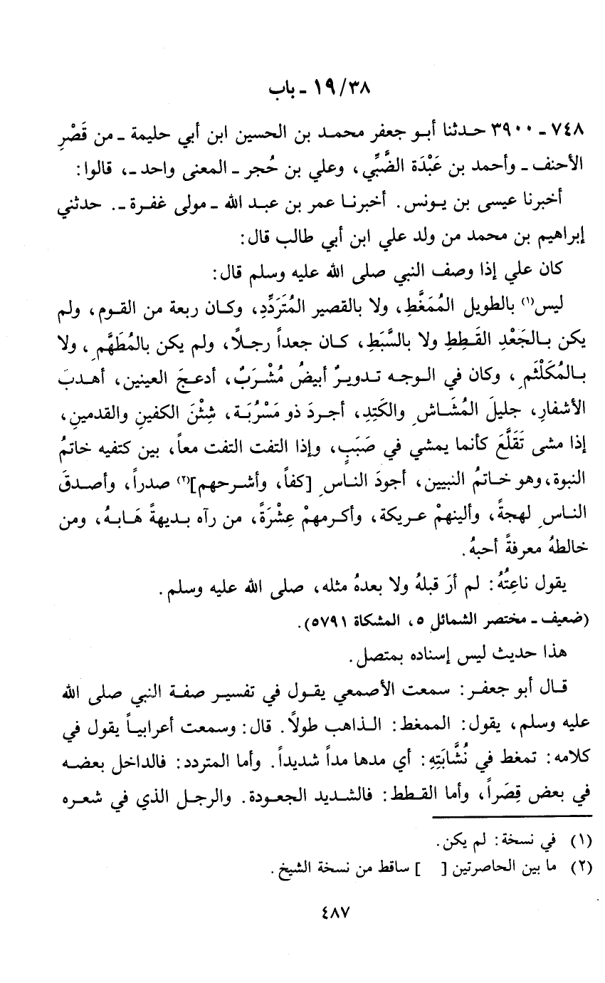 38 / 19 - باب 748 - 3900 حدثنا أبو جعفر محمد بن الحسين ابن أبي حليمة - من قصر الاحنف - وأحمد بن عبدة الضبي، وعلي بن حجر - المعنى واحد -، قالوا: أخبرنا عيسى بن يونس.