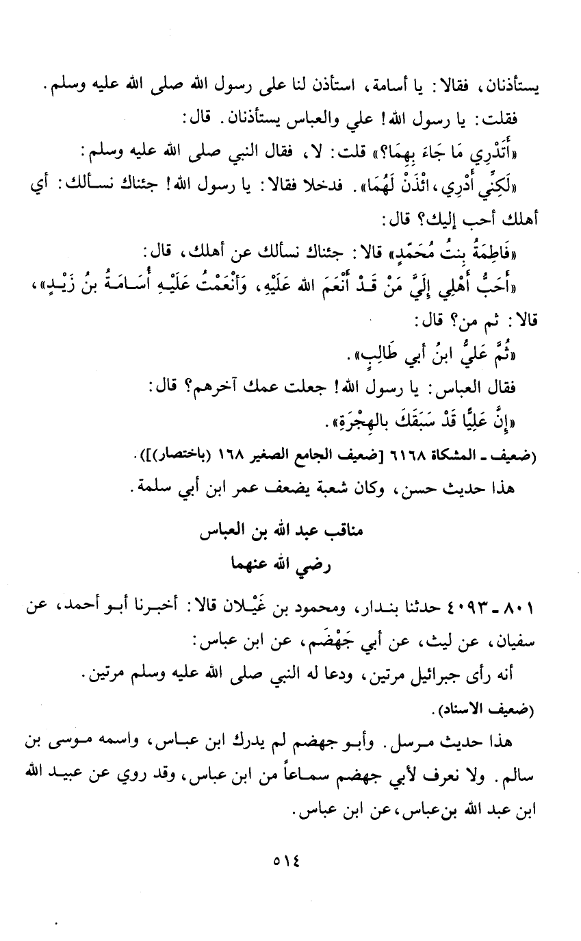 أهلك أحب إليك؟ قال: " فاطمة بنت محمد " قالا: جئناك نسألك عن أهلك، قال: " أحب أهلي إلي من قد أنعم الله عليه، وأنعمت عليه أسامة بن زيد "، قالا: ثم من؟ قال: " ثم علي ابن أبي طالب ".