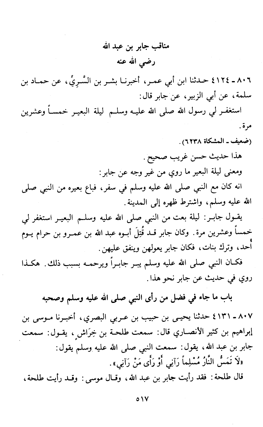 806 - 4124 حدثنا ابن أبي عمر، أخبرنا بشر بن السري، عن حماد بن سلمة، عن أبي الزبير، عن جابر قال: استغفر لي رسول الله صلى الله عليه وسلم ليلة البعير خمسا وعشرين مرة.