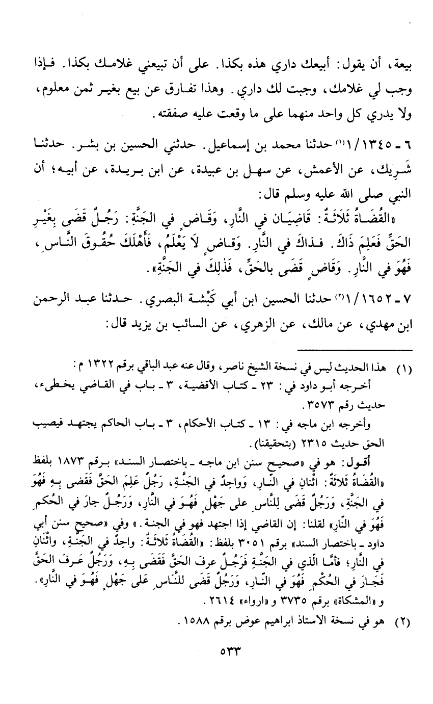 " وفي " صحيج سنن أبي داود - باختصار السند " برقم 3051 بلفظ: " القضاة ثلاثة: واحد في الجنة، واثنان في الانر.