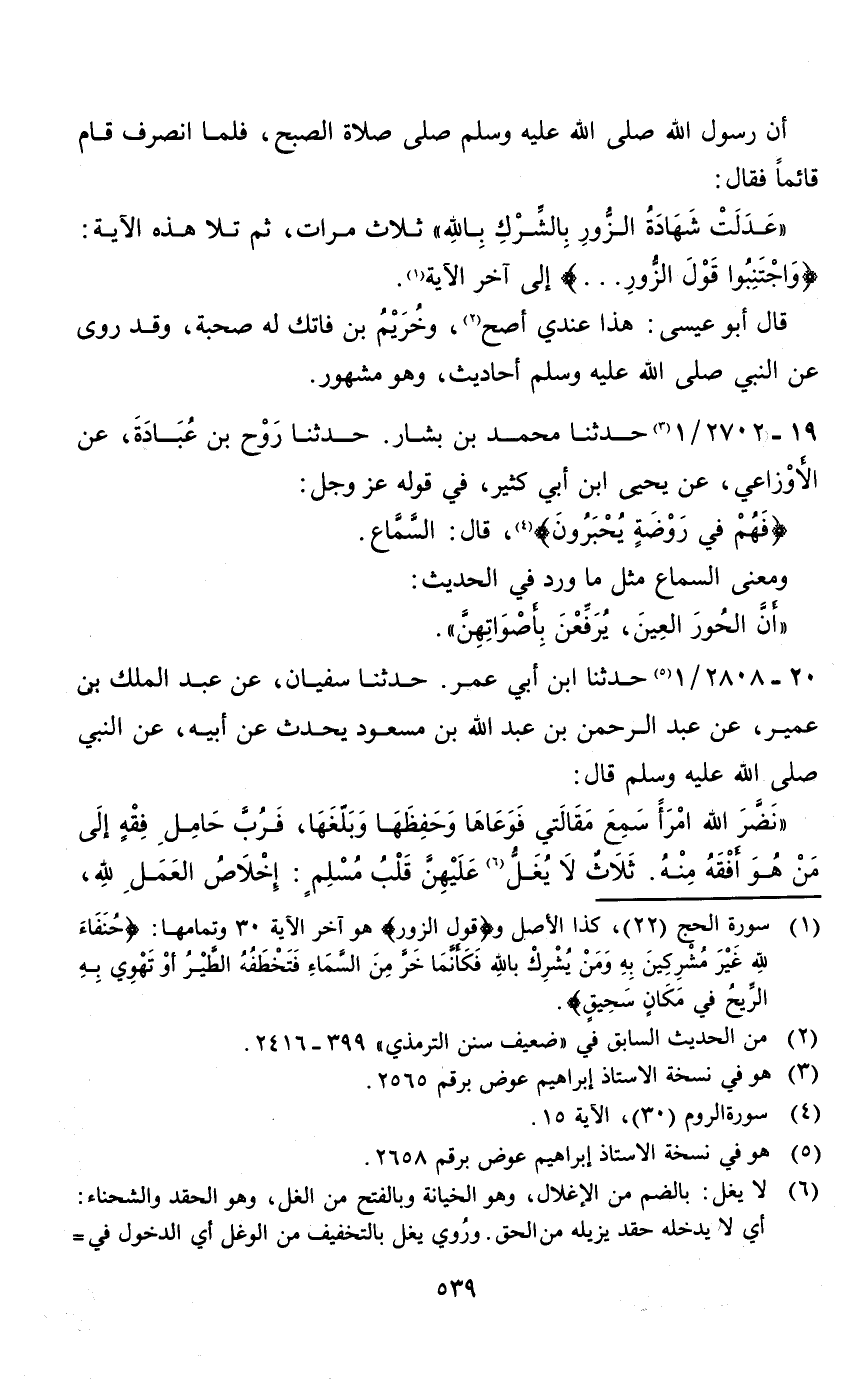 (1) سورة الحج (22) ، كذا الاصل و (قول الزور) هو آخر الآية 30 وتمامها: (حنفاء لله غير مشركين به ومن يشرك بالله فكأنما خر من السماء فتخطفه الطير أو تهوي به الريح في مكان سحيق) .