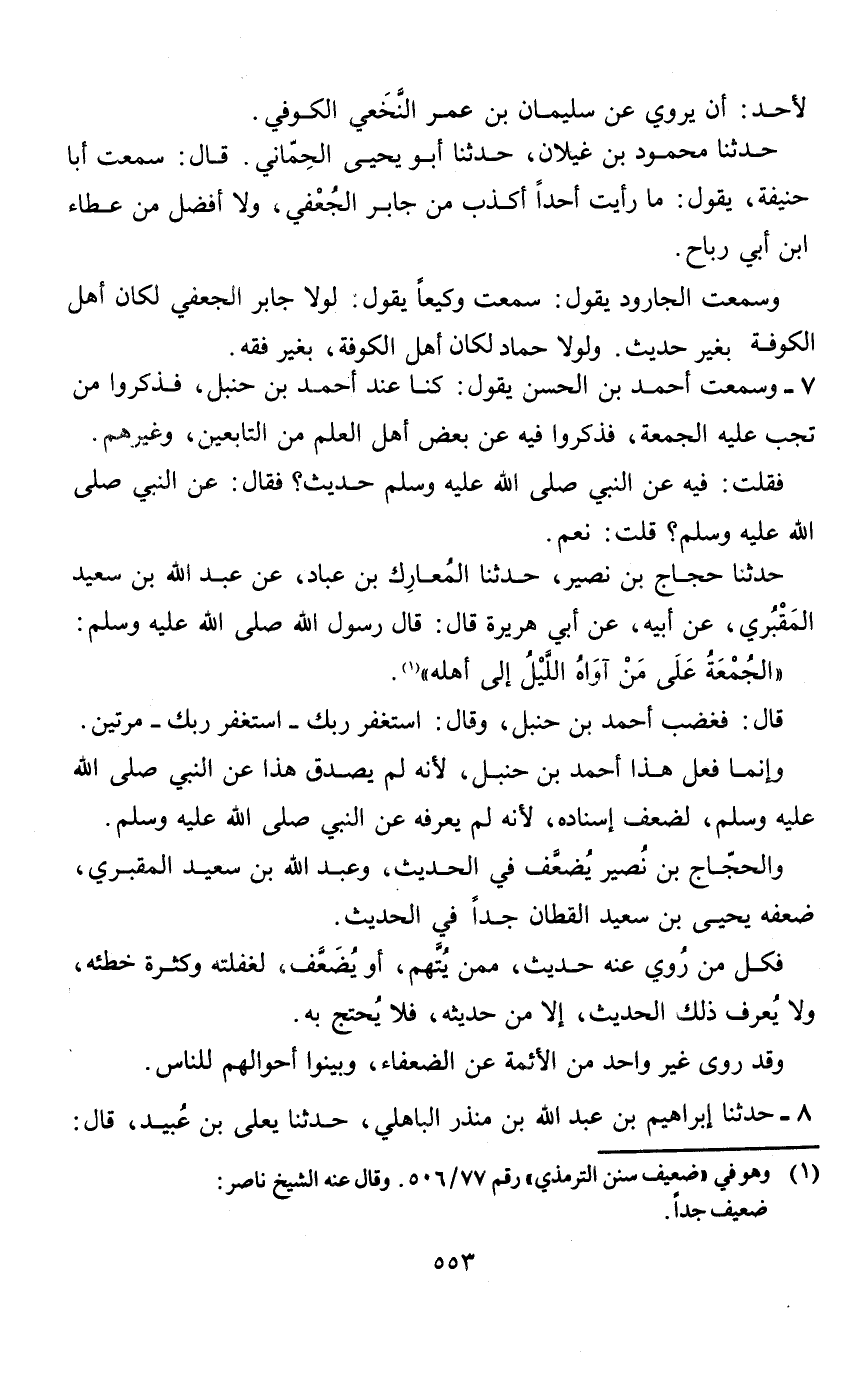 7 - وسمعت أحمد بن الحسن يقول: كنا عند أحمد بن حنبل، فذكروا من تجب عليه الجمعة، فذكروا فيه عن بعض أهل العلم من التابعين، وغيرهم.