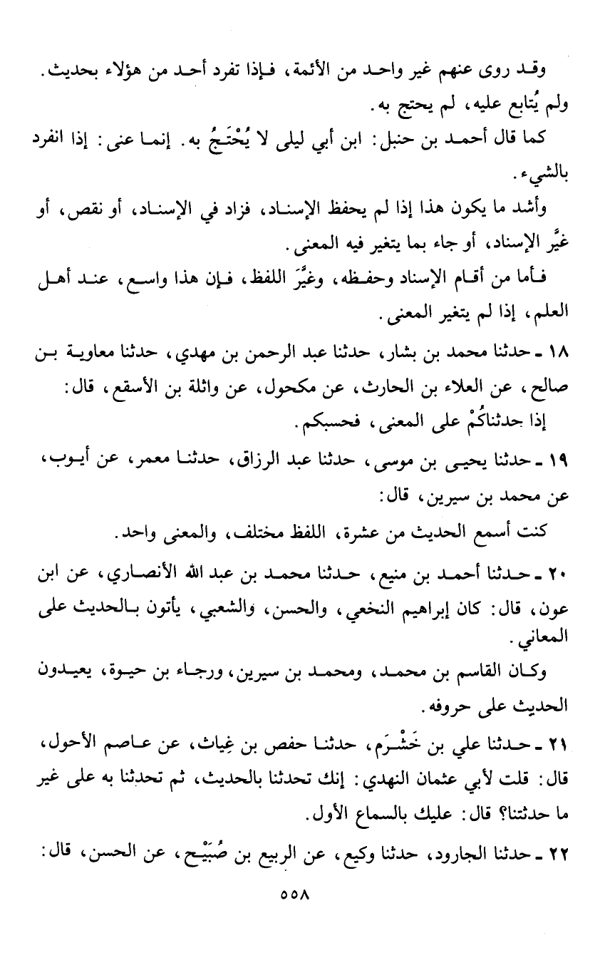 20 - حدثنا أحمد بن منيع، حدثنا محمد بن عبد الله الانصاري، عن ابن عون، قال: كان إبراهيم النخعي، والحسن، والشعبي، يأتون بالحديث على المعاني.