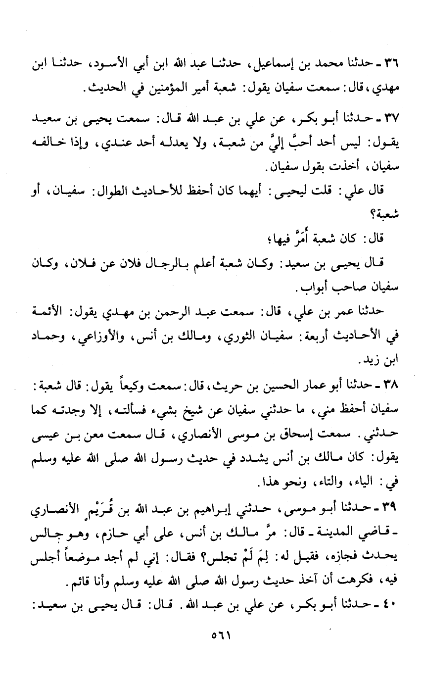 36 - حدثنا محمد بن إسماعيل، حدثنا عبد الله ابن أبي الاسود، حدثنا ابن مهدي، قال: سمعت سفيان يقول: شعبة أمير المؤمنين في الحديث.