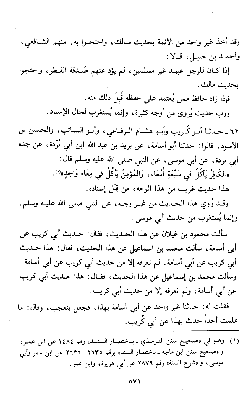 62 - حدثنا أبو كريب وأبو هشام الرفاعي، وأبو السائب، والحسين بن الاسود، قالوا: حدثنا أبو أسامة، عن بريد بن عبد الله ابن أبي بردة، عن جده أبي بردة، عن أبي موسى، عن النبي صلى الله عليه وسلم قال: " الكافر يأكل في سبعة أمعاء، والمؤمن يأكل في معاء واحد " (1) .