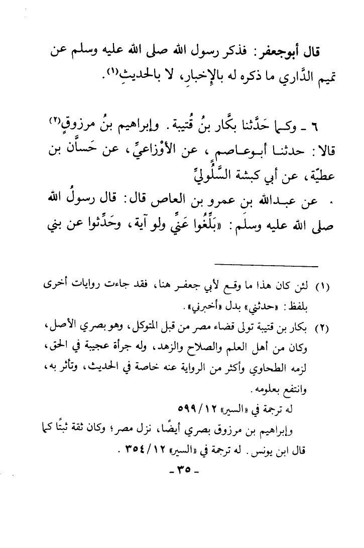 6 - وَكَمَا حَدَّثَنَا بَكَّارُ بْنُ قُتَيْبَةَ، وَإِبْرَاهِيمُ بْنُ مَرْزُوقٍ، قَالا: حَدَّثَنَا أَبُو عَاصِمٍ، عَنِ الأَوْزَاعِيِّ، عَنْ حَسَّانِ بْنِ عَطِيَّةَ، عَنْ أَبِي كَبْشَةَ السَّلُولِيِّ، عَنْ عَبْدِ اللَّهِ بْنِ عَمْرِو بْنِ الْعَاصِ، قَالَ: قَالَ رَسُولُ اللَّهِ صَلَّى اللَّهُ عَلَيْهِ وَسَلَّمَ: «بَلِّغُوا عَنِّي وَلَوْ آيَةً، وَحَدِّثُوا عَنْ بَنِي