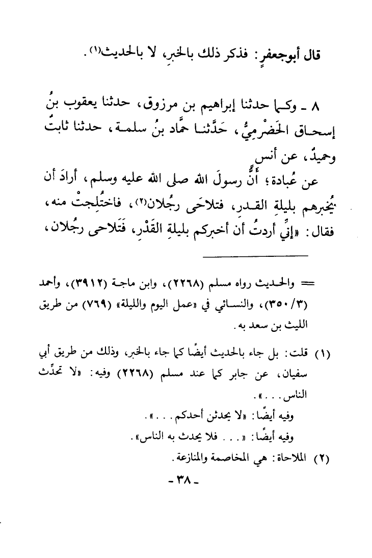 8 - وَكَمَا حَدَّثَنَا إِبْرَاهِيمُ بْنُ مَرْزُوقٍ، حَدَّثَنَا يَعْقُوبُ بْنُ إِسْحَاقَ الْحَضْرَمِيُّ، حَدَّثَنَا حَمَّادُ بْنُ سَلَمَةَ، حَدَّثَنَا ثَابِتٌ وَحُمَيْدٌ، عَنْ أَنَسٍ، عَنْ عُبَادَةَ، أَنَّ رَسُولَ اللَّهِ صَلَّى اللَّهُ عَلَيْهِ وَسَلَّمَ، أَرَادَ أَنْ يُخْبِرَهُمْ بِلَيْلَةِ الْقَدْرِ، فَتَلاحَى رَجُلانِ،