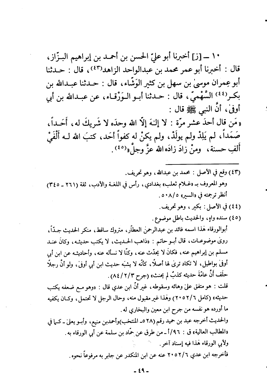 10 - أَخْبَرَنَا أَبُو عَلِيٍّ الْحَسَنُ بْنُ أَحْمَدَ بْنِ إِبْرَاهِيمَ الْبَزَّازُ، قَالَ: أَخْبَرَنَا أَبُو عُمَرَ مُحَمَّدُ بْنُ عَبْدِ الْوَاحِدِ الزَّاهِدُ، قَالَ: حَدَّثَنَا أَبُو عِمْرَانَ مُوسَى بْنُ سَهْلِ بْنِ كَثِيرٍ الْوَشَّاءُ، قَالَ: حَدَّثَنَا عَبْدُ اللَّهِ بْنُ بَكْرٍ السَّهْمِيُّ، قَالَ: حَدَّثَنَا أَبُو الْوَرْقَاءِ، عَنْ عَبْدِ اللَّهِ بْنِ أَبِي أَوْفَى،