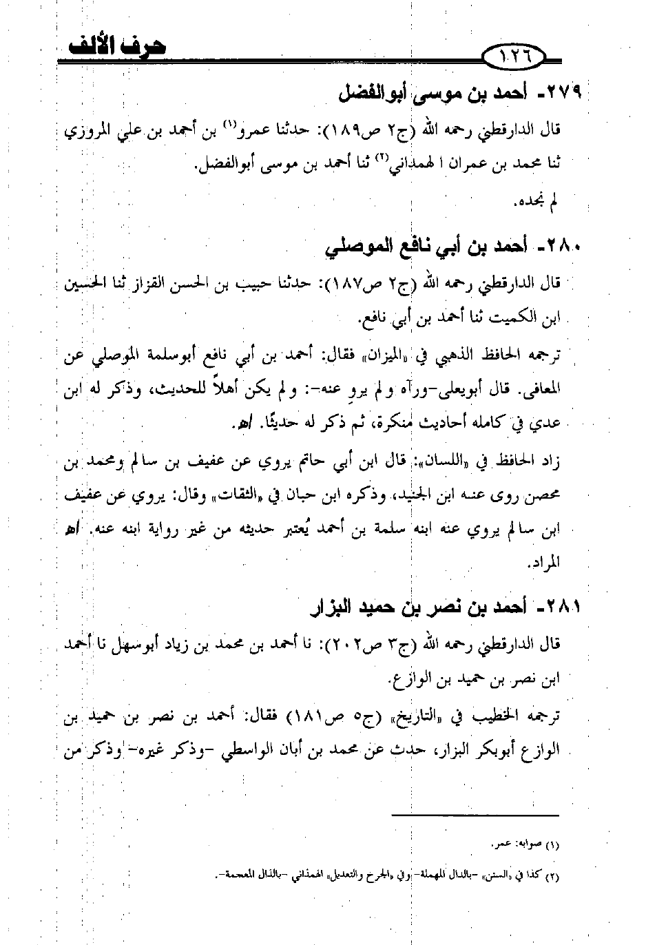 قال الدارقطني - رحمه الله - (ج 2 ص 189): حدثنا عمرو بن أحمد بن علي المروزي، ثنا محمد بن عمران الهمداني، ثنا أحمد بن موسى أبو الفضل.