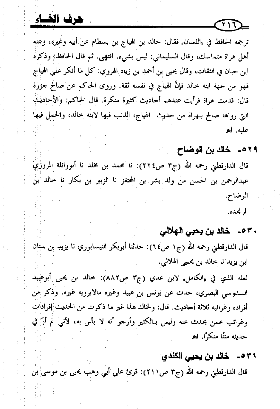 ترجمه الحافظ في " اللسان " فقال: خالد بن الهياج بن بسطام عن أبيه وغيره، وعنه أهل هراة، متماسك، وقال السليماني: ليس بشيء. انتهى. ثم قال الحافظ: وذكره ابن حبان في الثقات، وقال يحيى بن أحمد بن زياد الهروي: كل ما أنكر على الهياج فهو من جهة ابنه خالد، فإن الهياج في نفسه ثقة، وروى الحاكم عن صالح جزرة قال: قدمت هراة فرأيت عندهم أحاديث كثيرة منكرة، قال الحاكم: والأحاديث التي رواها صالح بهراة من حديث الهياج، الذنب فيها لابنه خالد، والحمل فيها عليه. ا. هـ.