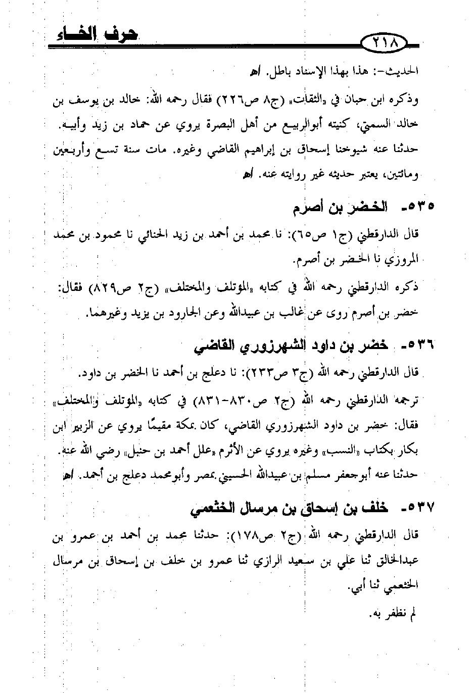 ترجمه الدارقطني - رحمه الله - (ج 2 ص 830 - 831) في كتابه " المؤتلف والمختلف " فقال: خضر بن داود الشهرزوري القاضي، كان بمكة مقيما يروي عن الزبير بن بكار بكتاب " النسب " وغيره يروي عن الأثرم " علل أحمد بن حنبل " رضي الله عنه، حدثنا عنه أبو جعفر مسلم بن عبيد الله الحسيني بمصر وأبو محمد دعلج بن أحمد. ا. هـ.
