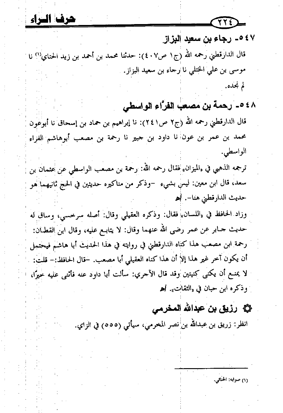 وزاد الحافظ في " اللسان " فقال: وذكره العقيلي، وقال: أصله سرخسي، وساق له حديث جابر عن عمر رضي الله عنهما، وقال: لا يتابع عليه، وقال ابن القطان: رحمة بن مصعب هذا كناه الدارقطني في روايته في هذا الحديث أبا هاشم فيحتمل أن يكون آخر غير هذا، إلا أن هذا كناه العقيلي أبا مصعب، قال الحافظ: قلت: لا يمنع أن يكنى كنيتين، وقد قال الآجري: سألت أبا داود عنه فأثنى عليه خيرا، وذكره ابن حبان في " الثقات ". ا. هـ.