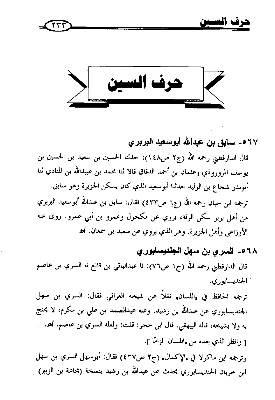 وترجمه ابن ماكولا في " الإكمال " (ج 2 ص 437) فقال: أبو سهل السري بن سهل بن خربان الجنديسابوري، يحدث عن عبد الله بن رشيد بنسخة (مجاعة بن الزبير)