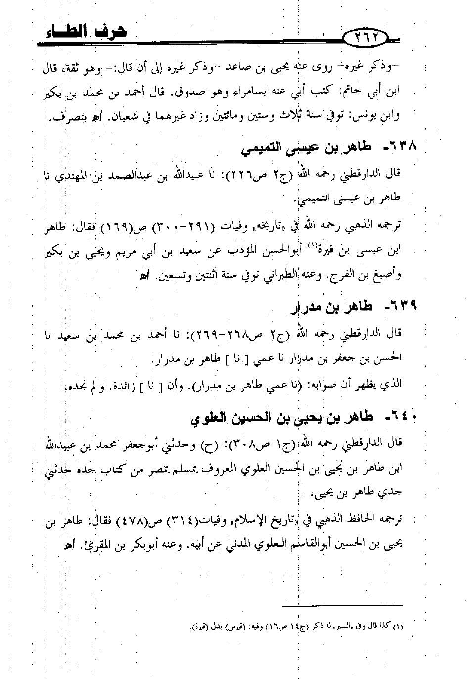 قال الدارقطني - رحمه الله - (ج 1 ص 308): (ح) وحدثني أبو جعفر محمد بن عبيد الله بن طاهر بن يحيى بن الحسين العلوي المعروف بمسلم بمصر من كتاب جده، حدثني جدي طاهر بن يحيى.