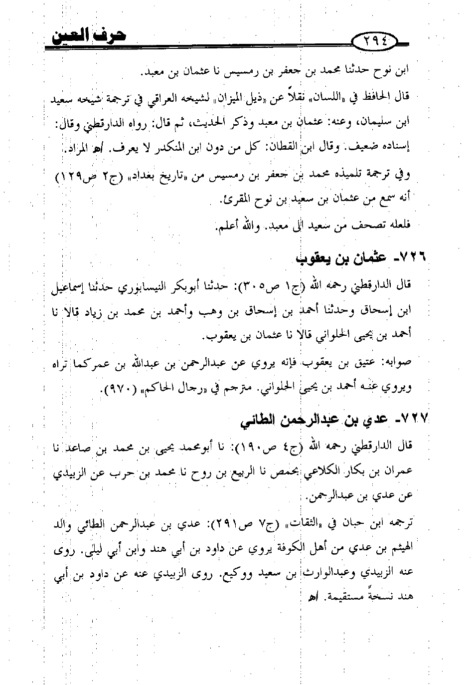 قال الدارقطني - رحمه الله - (ج 4 ص 190): نا أبو محمد يحيى بن محمد بن صاعد، نا عمران بن بكار الكلاعي بحمص، نا الربيع بن روح، نا محمد بن حرب، عن الزبيدي، عن عدي بن عبد الرحمن.