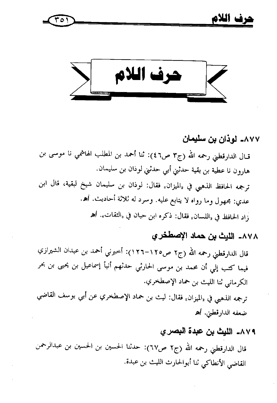 قال الدارقطني - رحمه الله - (ج 2 ص 125 - 126): أخبرني أحمد بن عبدان الشيرازي فيما كتب إلي، أن محمد بن موسى الحارثي حدثهم، أنبأ إسماعيل بن يحيى بن بحر الكرماني، ثنا الليث بن حماد الإصطخري.