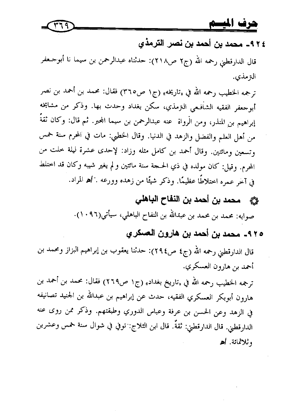 ترجمه الخطيب - رحمه الله - في " تاريخ بغداد " (ج 1 ص 269) فقال: محمد بن أحمد بن هارون أبو بكر العسكري الفقيه، حدث عن إبراهيم بن عبد الله بن الجنيد تصانيفه في الزهد، وعن الحسن بن عرفة وعباس الدوري وطبقتهم، وذكر ممن روى عنه الدارقطني، قال الدارقطني: ثقة، قال ابن الثلاج: توفي في شوال سنة خمس وعشرين وثلاثمائة. ا. هـ.