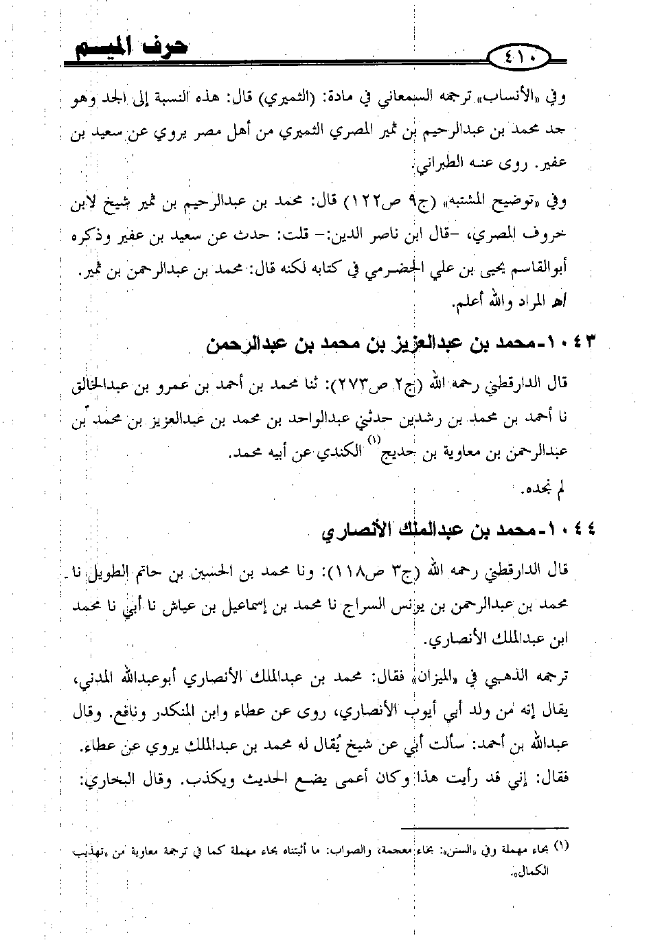 وفي " توضيح المشتبه " (ج 9 ص 122) قال: محمد بن عبد الرحيم بن ثمير شيخ لابن خروف المصري، قال ابن ناصر الدين: قلت: حدث عن سعيد بن عفير، وذكره أبو القاسم يحيى بن علي الحضرمي في كتابه لكنه قال: محمد بن عبد الرحمن بن ثمير. ا. هـ المراد والله أعلم.