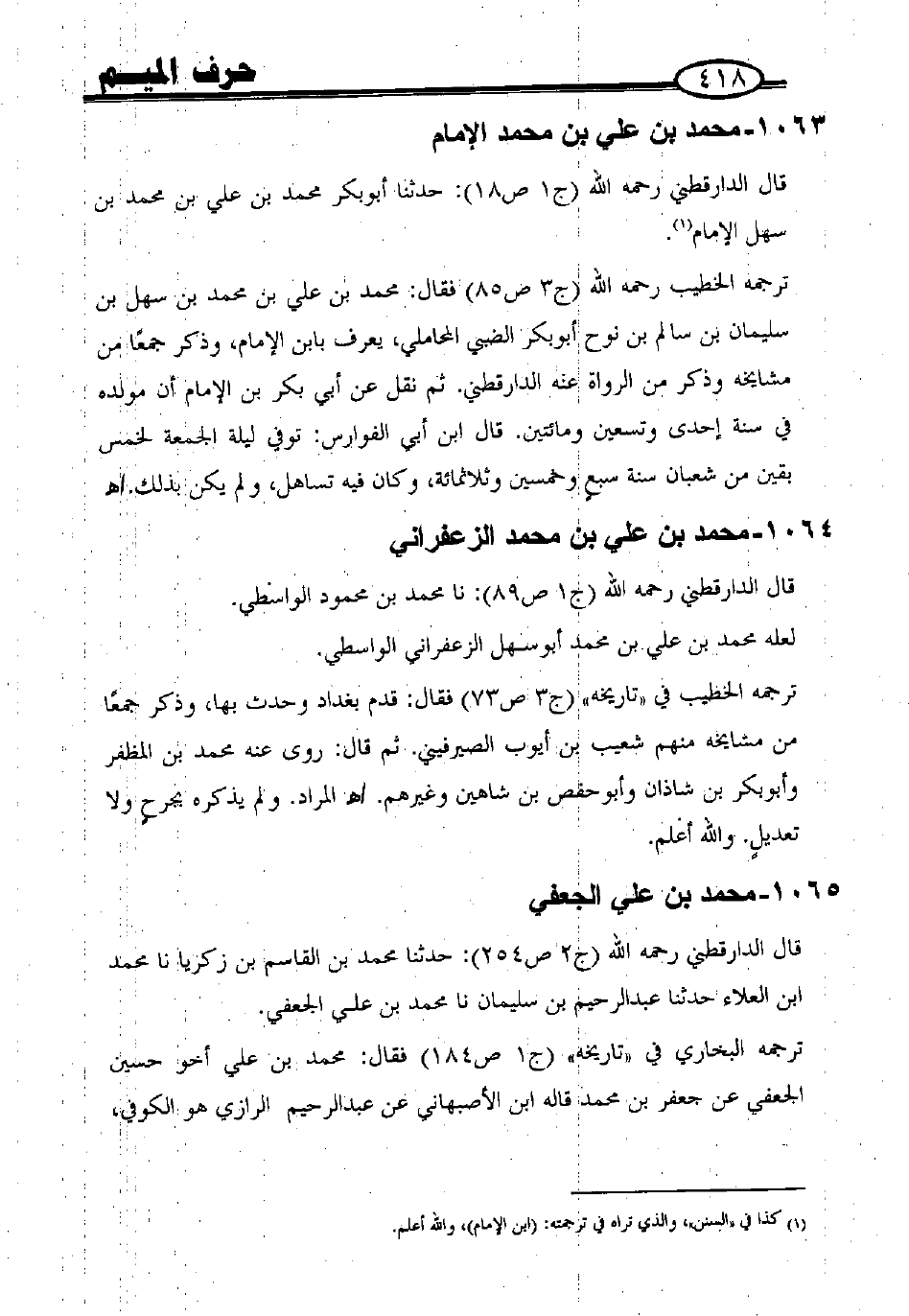 قال الدارقطني - رحمه الله - (ج 2 ص 254): حدثنا محمد بن القاسم بن زكريا، نا محمد بن العلاء، حدثنا عبد الرحيم بن سليمان، نا محمد بن علي الجعفي.