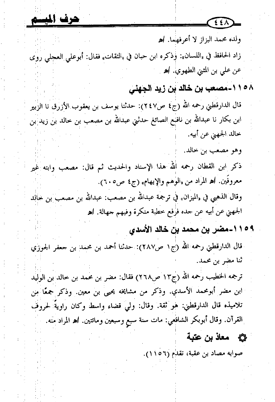 قال الدارقطني - رحمه الله - (ج 4 ص 247): حدثنا يوسف بن يعقوب الأزرق، نا الزبير بن بكار، نا عبد الله بن نافع الصائغ، حدثني عبد الله بن مصعب بن خالد بن زيد بن خالد الجهني عن أبيه.