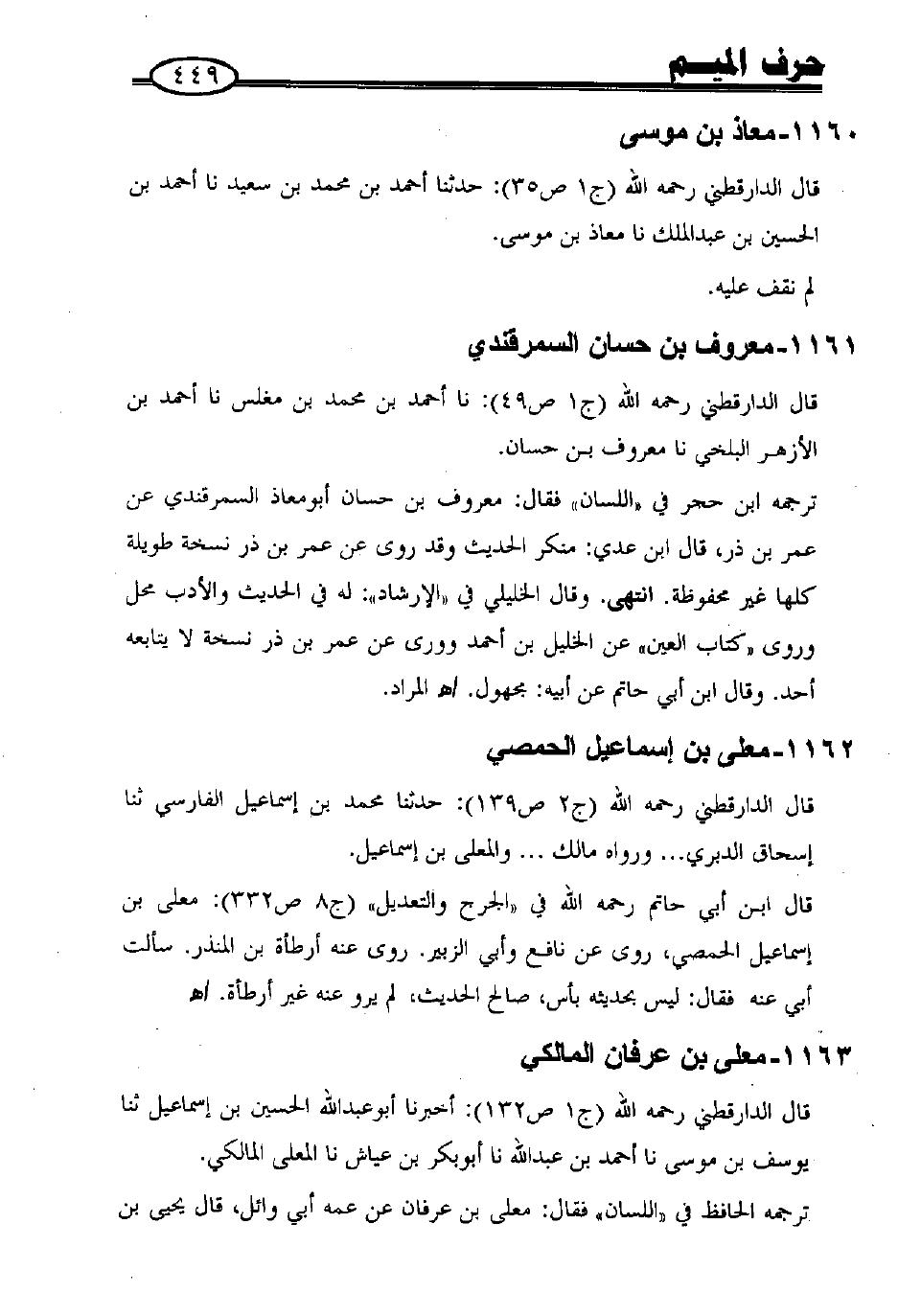 1162 - معلى بن إسماعيل الحمصي قال الدارقطني - رحمه الله - (ج 2 ص 139): حدثنا محمد بن إسماعيل الفارسي، ثنا إسحاق الدبري. . .، ورواه مالك. . .، والمعلى بن إسماعيل.