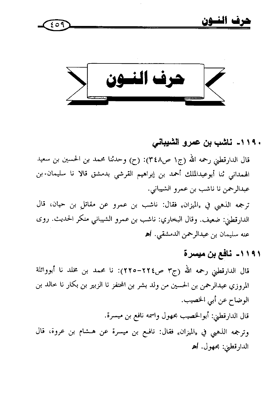 قال الدارقطني - رحمه الله - (ج 1 ص 348): (ح) وحدثنا محمد بن الحسين بن سعيد الهمداني، ثنا أبو عبد الملك أحمد بن إبراهيم القرشي بدمشق، قالا: نا سليمان بن عبد الرحمن، نا ناشب بن عمرو الشيباني.