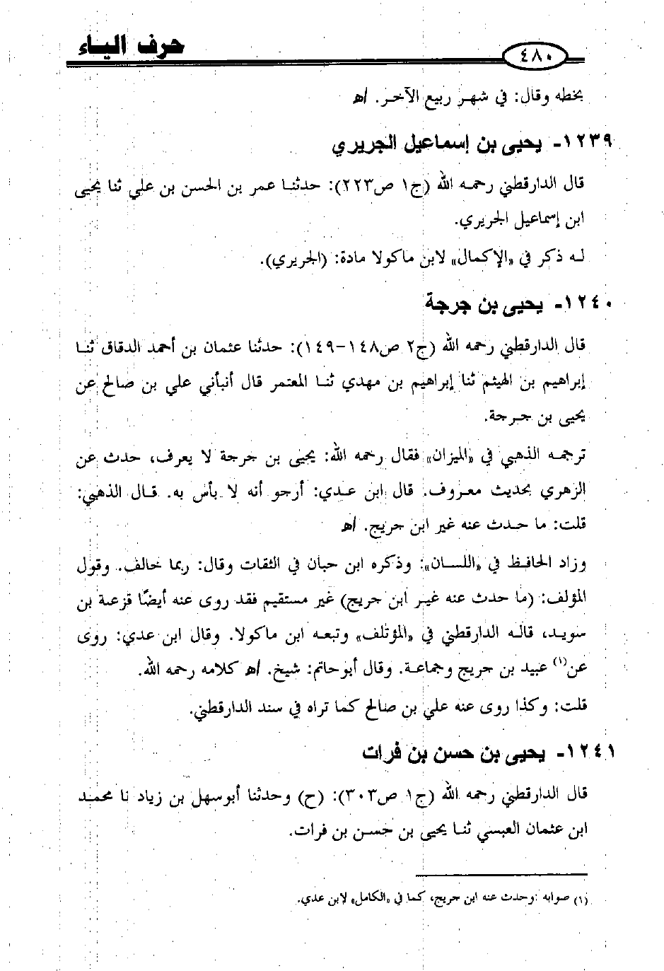قال الدارقطني - رحمه الله - (ج 2 ص 148 - 149): حدثنا عثمان بن أحمد الدقاق، ثنا إبراهيم بن الهيثم، ثنا إبراهيم بن مهدي، ثنا المعتمر قال: أنبأني علي بن صالح، عن يحيى بن جرجة.