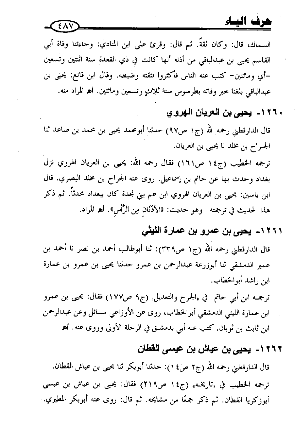 ترجمه الخطيب (ج 14 ص 161) فقال - رحمه الله -: يحيى بن العريان الهروي، نزل بغداد، وحدث بها عن حاتم بن إسماعيل، روى عنه الجراح بن مخلد البصري، قال ابن ياسين: يحيى بن العريان الهروي ابن عم بني نجدة، كان ببغداد محدثا، ثم ذكر هذا الحديث في ترجمته، وهو حديث «الأذنان من الرأس». ا. هـ المراد.