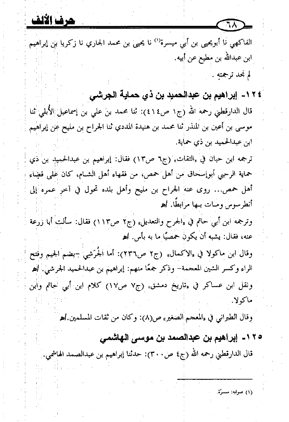 وقال ابن ماكولا في " الإكمال " (ج 2 ص 236): أما الجرشي - بضم الجيم وفتح الراء وكسر الشين المعجمة - وذكر جمعا منهم: إبراهيم بن عبد الحميد الجرشي. ا. هـ ونقل ابن عساكر في " تاريخ دمشق " (ج 7 ص 17) كلام ابن أبي حاتم وابن ماكولا. .