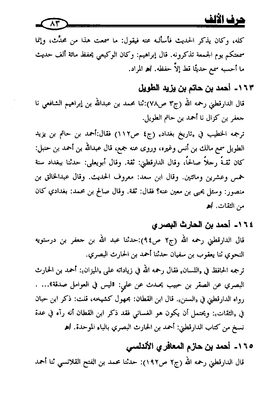 ترجمه الحافظ في " اللسان " فقال - رحمه الله - في زياداته على " الميزان " أحمد بن الحارث البصري، عن الصقر بن حبيب، يحدث عن علي: " ليس في العوامل صدقة " رواه الدارقطني في " السنن " قال ابن القطان: مجهول كشيخه، قلت: ذكر ابن حبان في " الثقات ": ويحتمل أن يكون هو الغساني فقد ذكر ابن القطان أنه رآه في عدة نسخ من كتاب الدارقطني: أحمد بن الحارث البصري بالباء الموحدة. ا. هـ.