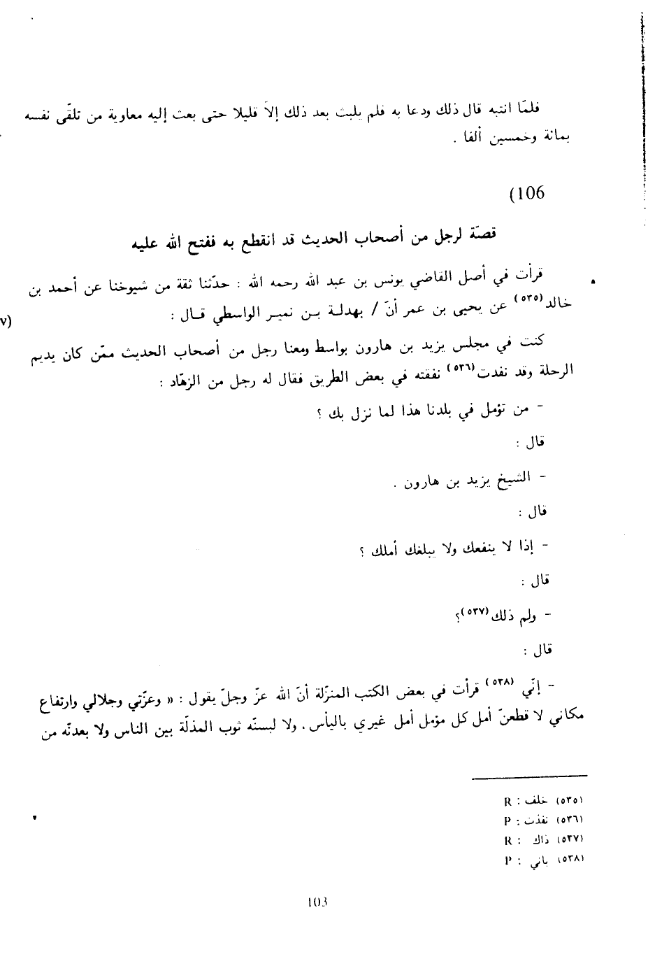 105 - قرأ بخط يونس بن عبد الله القاضي، ثنا بعض الأدباء وقال: ثنا أبو يعقوب الأهوازي الضرير بواسط، قال: أنا علي بن سليمان الأخفش، قال: ثنا الحسن بن الحسين، عن أبيه، قال: قال جعفر بن محمد: إن الحسن بن علي أراد أن يكتب إلى معاوية كتابا يستمنحه فيه، فغلبته عيناه، فرأى في النوم النبي صلى الله عليه وسلم يقول له: «أتكتب إلى مخلوق تسأله حاجتك، وتدع أن تسأل ربك» ؟ قل: «اللهم إني أسألك من كل أمر ضعفت عنه حيلتي، أن تعطيني منه ما لم تنته إليه رغبتي، ولم يخطر ببالي، ولم يجر على لساني، وأن تعطيني من اليقين ما يحجزني عن أن أسأل أحدا من العالمين، إنك على كل شيء قدير» .