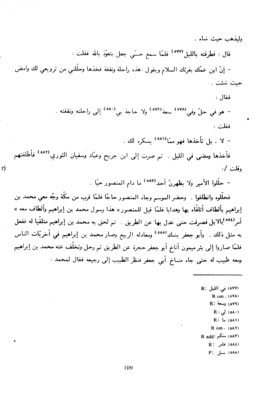 قال: فلما كان الليل، رأيت الأمير محمد بن إبراهيم منكسرا مفكرا، فسألته عن ذلك فقال لي: حبست عيونا من عيون المسلمين، وذا رحم من الأفاضل، فلعل المنصور يقتلهم ليعز سلطانه فأبوأ بإثمهم.